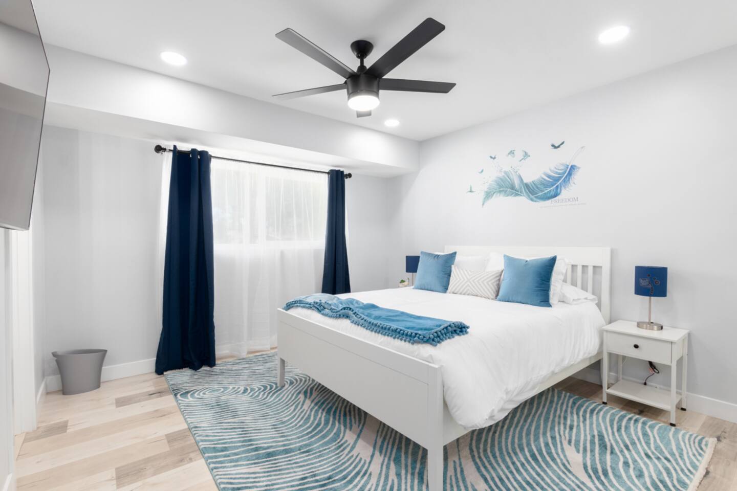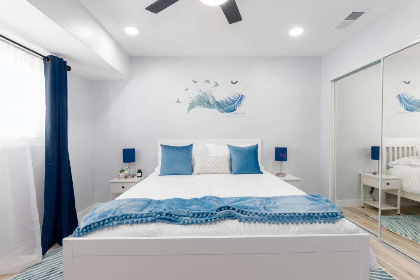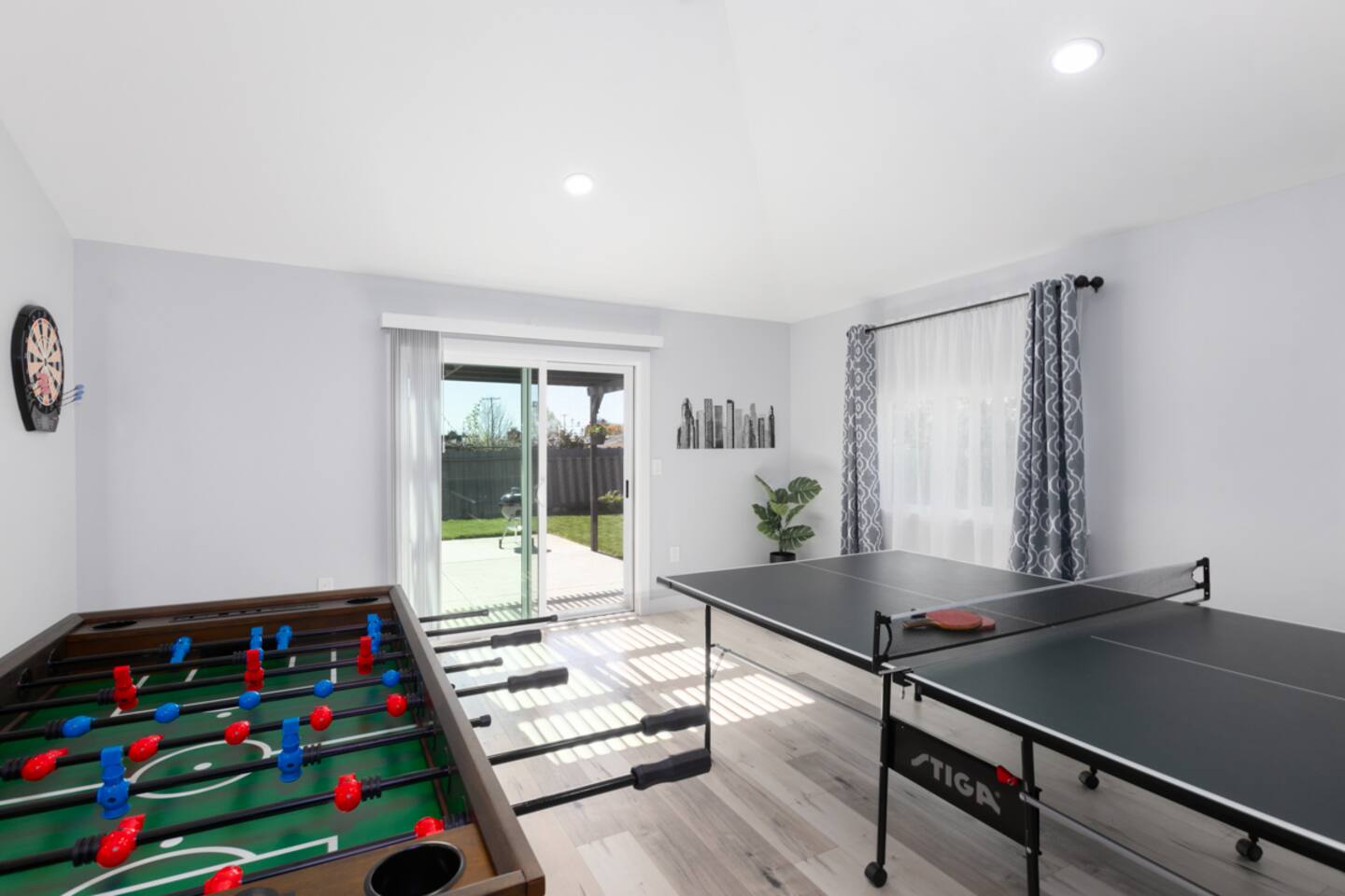 KEY FEATURES ✔ 3 bedrooms w/ blackout curtains (3 Queen (one is ensuite), 4 floor mattress) ✔ Game room w/ ping pong + foosball table ✔ 2 bathrooms ✔ Pet-friendly ✔ High speed internet + dedicated workspace ✔ Fully Equipped Kitchen ✔ Playpen for baby/small child ✔ BBQ Grill ✔ Washer + Dryer ✔ SMART TVs in all rooms with free NETFLIX & HBOMAX ✔ Beach equipment ✔ Board games ✔ Parking for 2 cars BEDROOMS + BATHROOMS Bedrooms This home features three cozy bedrooms, each with a 12" queen memory foam mattress for a restful night's sleep. For additional guests, there are two 6" and two 4" queen memory foam floor mattresses, which can be set up in the bedrooms or game room. You can also stack the floor mattresses for extra comfort, creating a 10" sleeping surface. Each bedroom is equipped with a wall-mounted Smart TV, offering free access to Netflix and HBO Max. Nightstands in two of the bedrooms include convenient USB charging ports. A Pack-n-Play/playard is available for families traveling with little ones. Workspace One bedroom features a study table and chair, perfect for remote work or studying. There is also an additional folding desk available for co-working or shared study sessions. Bathrooms Both bathrooms are equipped with luxurious rain shower heads for a spa-like experience. We provide complimentary Eco Botanics White Tea and Honey body wash, shampoo, and conditioner, all of which are gluten-free, paraben-free, and cruelty-free. Each bathroom is also stocked with hair dryers and makeup towels for your convenience. **Please note: The master bathroom door is only 25 inches wide.** KITCHEN & DINING This stunning kitchen is fully equipped with everything you need to prepare a family meal, including a wide selection of pots, pans, and a variety of cooking spices. You'll find essential appliances such as a microwave oven, toaster oven, crockpot, rice cooker, blender, mixer, electric kettle, and a coffee maker with complimentary coffee, creamer, sugar, sweeteners, and tea. Kid-friendly, shatter-proof plates, cups, and utensils are also readily available. The sleek dining table seats 8 comfortably, with an additional four height-adjustable bar stools at the spacious kitchen counter. For families with little ones, a free Evenflo 4-in-1 convertible high chair is always available for use. LOUNGE SPACES & GAME ROOM The living room is a cozy entertainment hub, featuring a 75” Samsung Smart TV with free Netflix and HBO Max, perfect for movie nights or catching up on your favorite shows. With 1000 Mbps high-speed Wi-Fi, staying connected is effortless. The space also includes an Ecobee thermostat to keep the temperature just right. For family fun, we provide classic games and toys for little ones. The game room adds a competitive edge to your stay with a foosball table, ping pong table, and an electronic dart board, offering hours of fun for guests of all ages. OUTSIDE SPACE Backyard: Relax in a private, fenced-in backyard perfect for the whole family. Enjoy outdoor dining and fire up the gas BBQ grill. While you cook your famous steak, your kids can play safely, and your pets can run freely in the spacious yard. Garage: The garage is equipped with a washer and dryer, complete with complimentary detergent and dryer sheets for your convenience. You can park in the garage, the driveway, or take advantage of the ample street parking available. Beach Accessories: Head to Pacific Beach fully prepared! The garage is stocked with beach essentials, including beach chairs, umbrellas, a beach blanket, toys, and a folding wagon—everything you need for a fun day in the sun. Book Now & Let Us Take Care Of You In San Diego! Registration number: STR-01297L, 642258