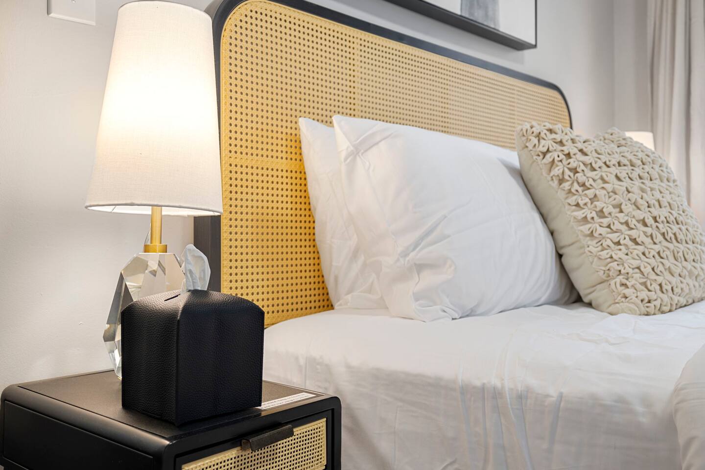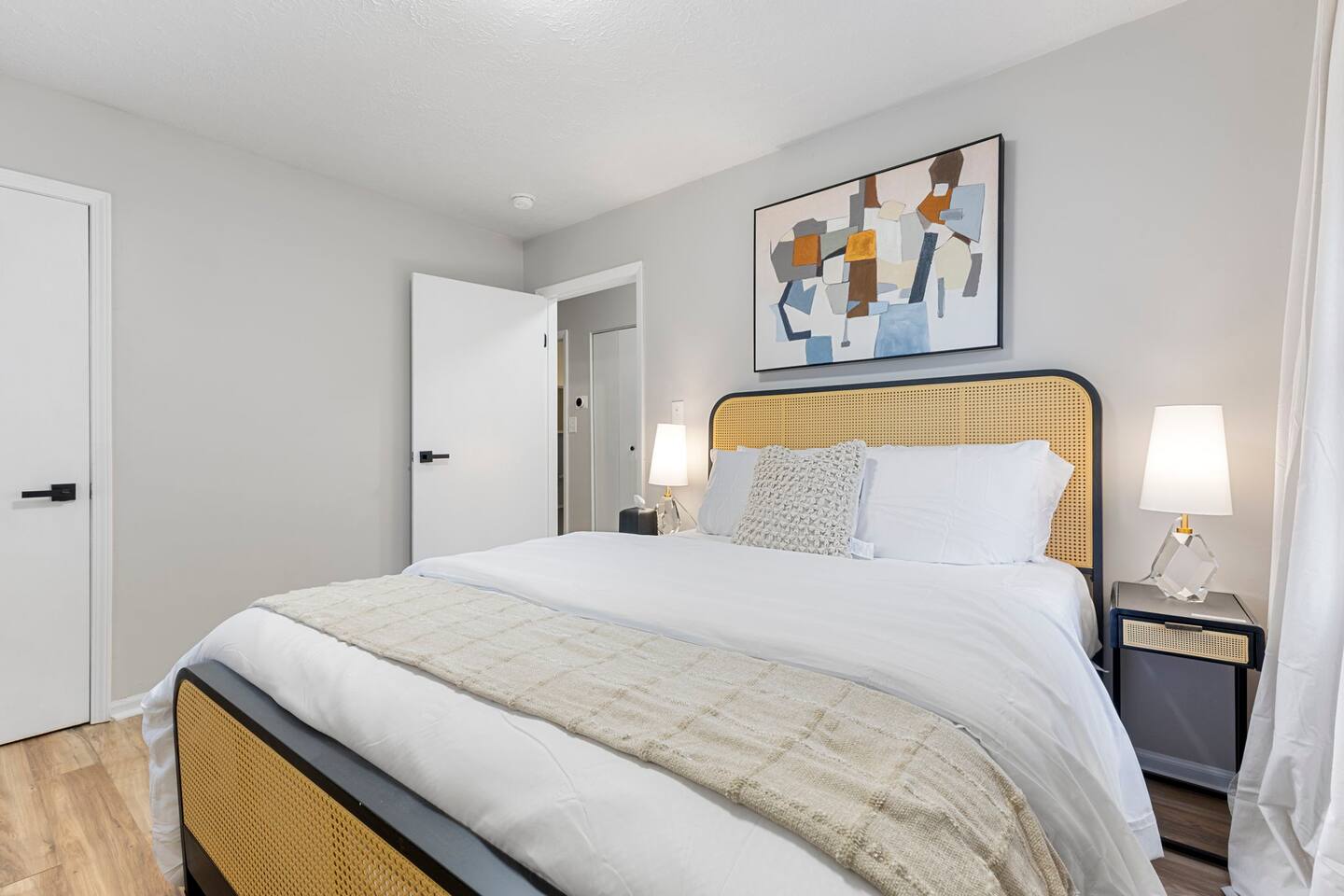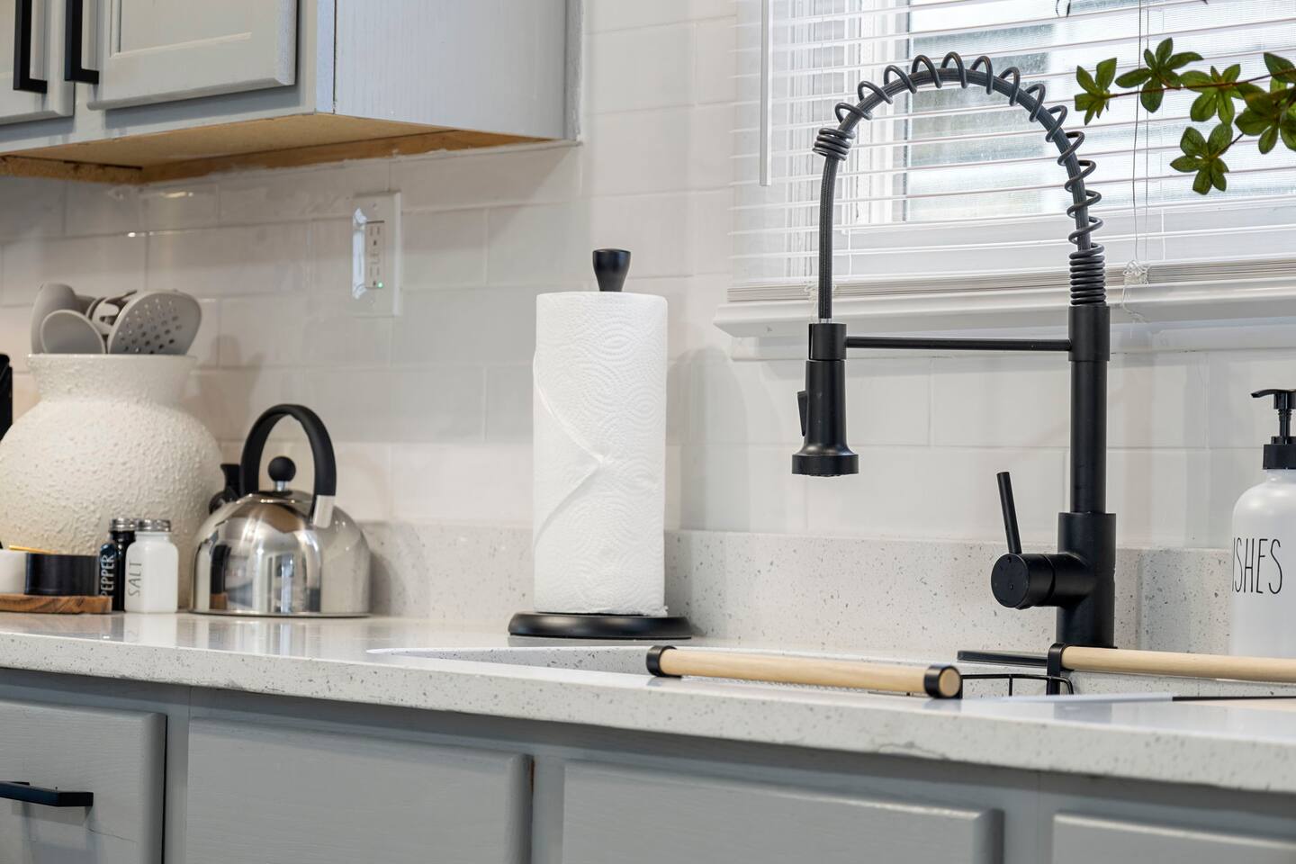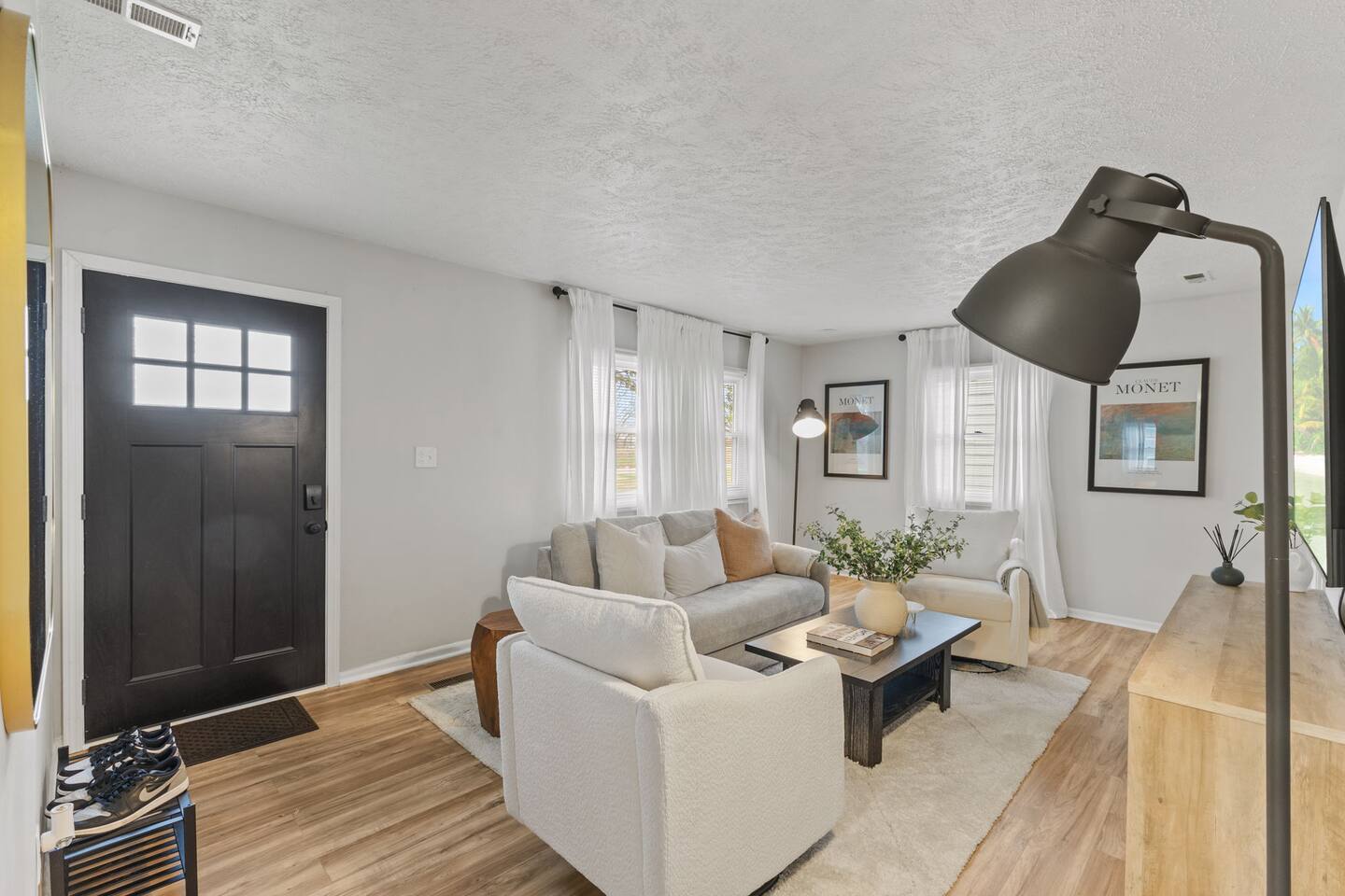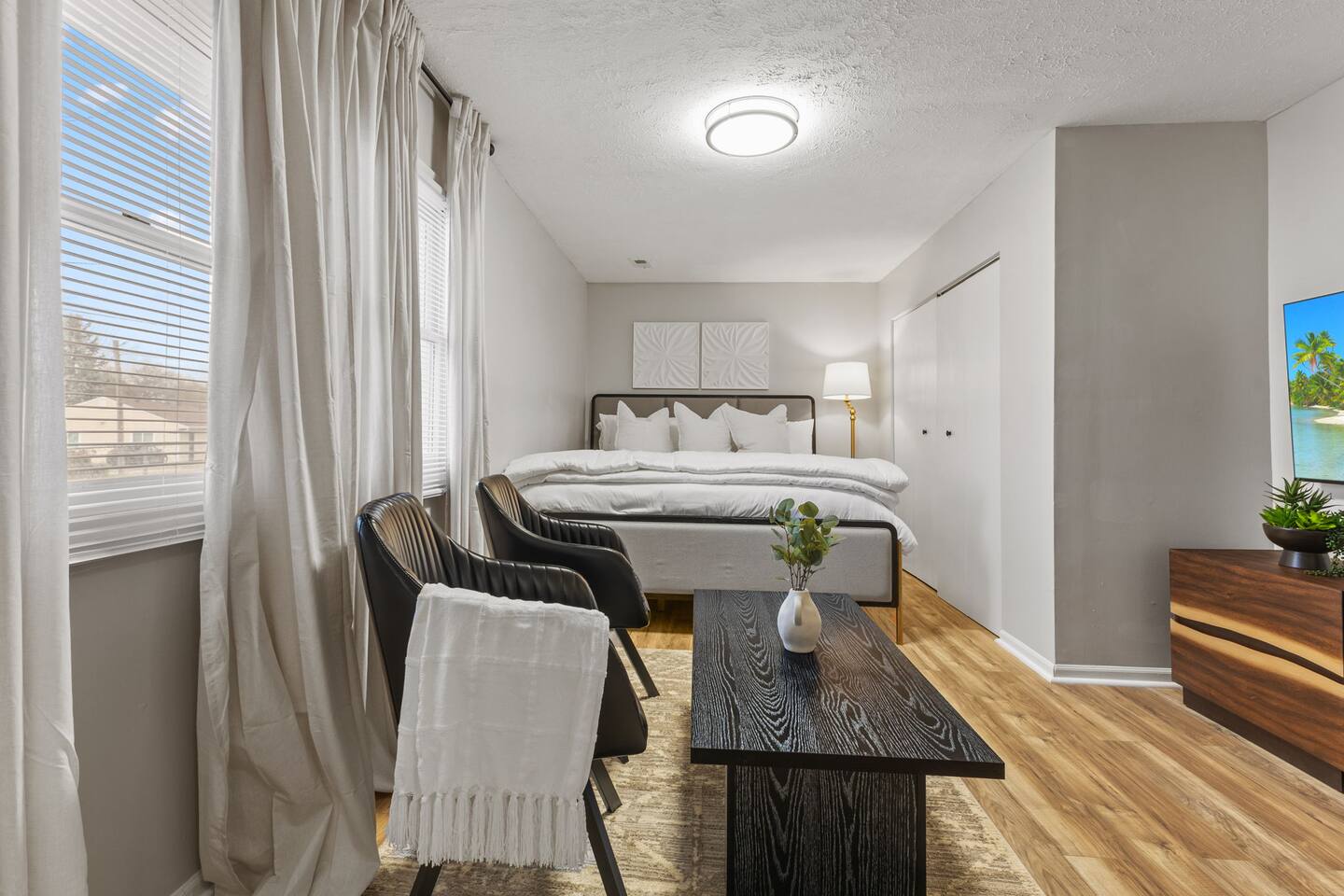 KEY FEATURES: ✔ 3 bedrooms with a King bed in the master suite, two queen beds plus a queen sofa bed in the living room, 8 max guests ✔ 2 bathrooms ✔ High speed internet + dedicated office space ✔ Fully Equipped Kitchen ✔ Playpen and high chair for baby/small child ✔ Washer + Dryer ✔ 65" Smart TV ✔ Family games BEDROOMS The master bedroom features a comfortable king-sized bed with plush pillows and a cozy duvet blanket. Two stylish armchairs with a matching throw blanket provide additional seating. A sleek coffee table sits between the chairs, perfect for enjoying a cup of coffee or a good book. Two other bedrooms have queen sized beds. All bedrooms are bathed in natural light from the large windows, which are adorned with flowing curtains. The neutral color palette and minimalist decor create an inviting atmosphere. Overall, this space is perfect for relaxation and rejuvenation. **Additional features** * A flat-screen Smart TV with Roku mounted on the wall (master bedroom only) * Ample closet space BATHROOMS Unwind and recharge in our clean and updated bathroom. The sleek design and soft lighting create a calm surrounding and the large mirror is perfect for getting ready. After a long day of exploring the city, soak in the bathtub and let the stress melt away. We provide complimentary Eco Botanics White Tea and Honey body wash, shampoo, and conditioner, all of which are gluten-free, paraben-free, and cruelty-free. A hair dryer, hair straightener, and makeup towels are provided for your convenience. OFFICE SPACE Need a quiet space to get work done during your stay? Escape and stay productive in our dedicated home office. The built-in bookshelves offer ample storage for your belongings, and the comfortable chair and desk provide a comfortable workspace. With **high-speed internet** throughout the house, you can easily connect to virtual meetings, send emails, and browse the web. Whether you're a digital nomad, a traveling professional, or simply working from home, our office space has you covered. KITCHEN + DINING Roll up your sleeves, unleash your inner chef and get cooking! We've stocked the kitchen with all the essential utensils, cooking pots, and small appliances you'll need to serve a family dinner. Whether you're a seasoned cook or a budding home chef, you'll love spending time in this space. You'll find essential appliances such as a microwave oven, toaster, rice cooker, blender, kettle, and a coffee maker with complimentary coffee, creamer, sugar, and tea. Kid-friendly, shatter-proof plates, bowls, drinking cups, and utensils are also readily available. The dining table seats 6 comfortably and for families with little ones, a slim foldable high chair with five point safety belt is always available for use. LIVING ROOM Come home to our cozy living room, sink into the plush couch, grab a blanket, and unwind with your favorite show on the smart TV. The room has plenty of natural light from the large windows, creating a bright and airy atmosphere. We've also included a selection of family board games to keep you entertained on rainy days or cozy evenings in. And when extra sleeping space is needed, the queen sofa bed provides a comfortable option for additional guests.