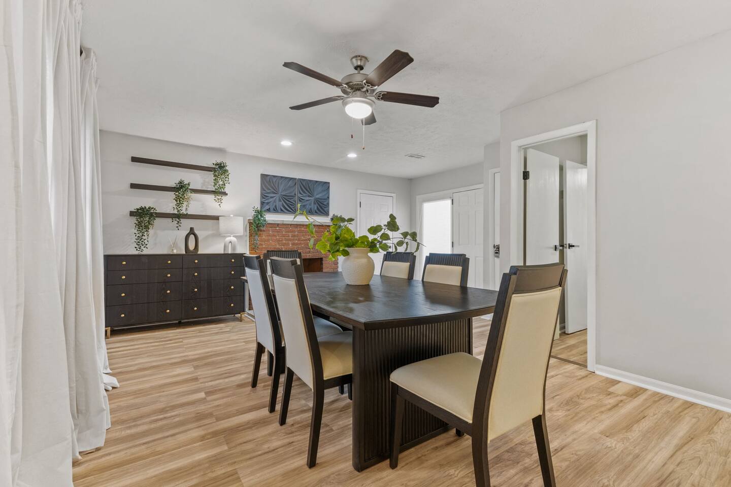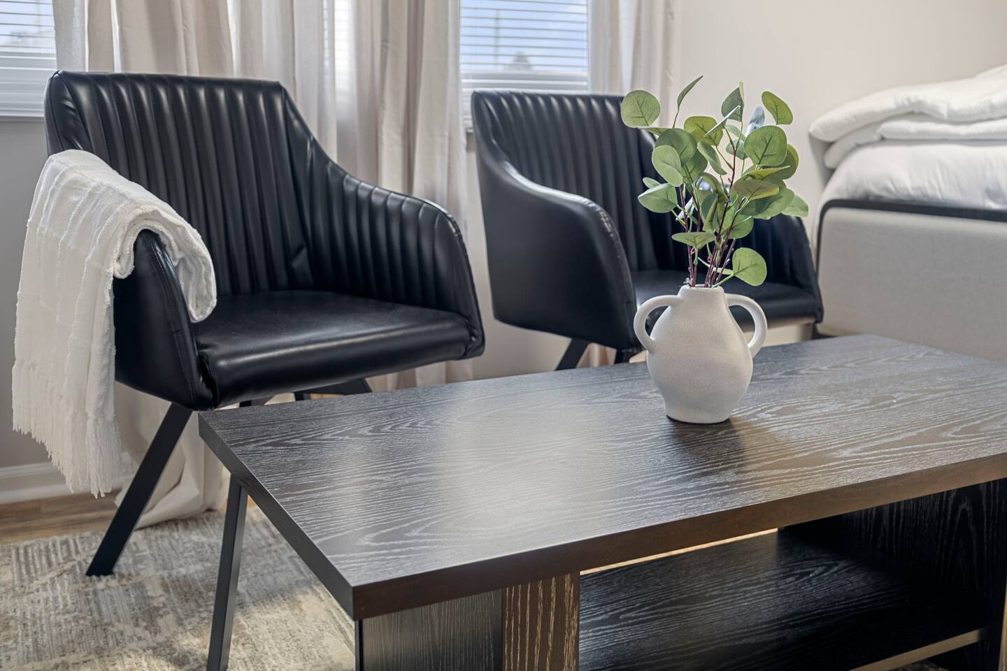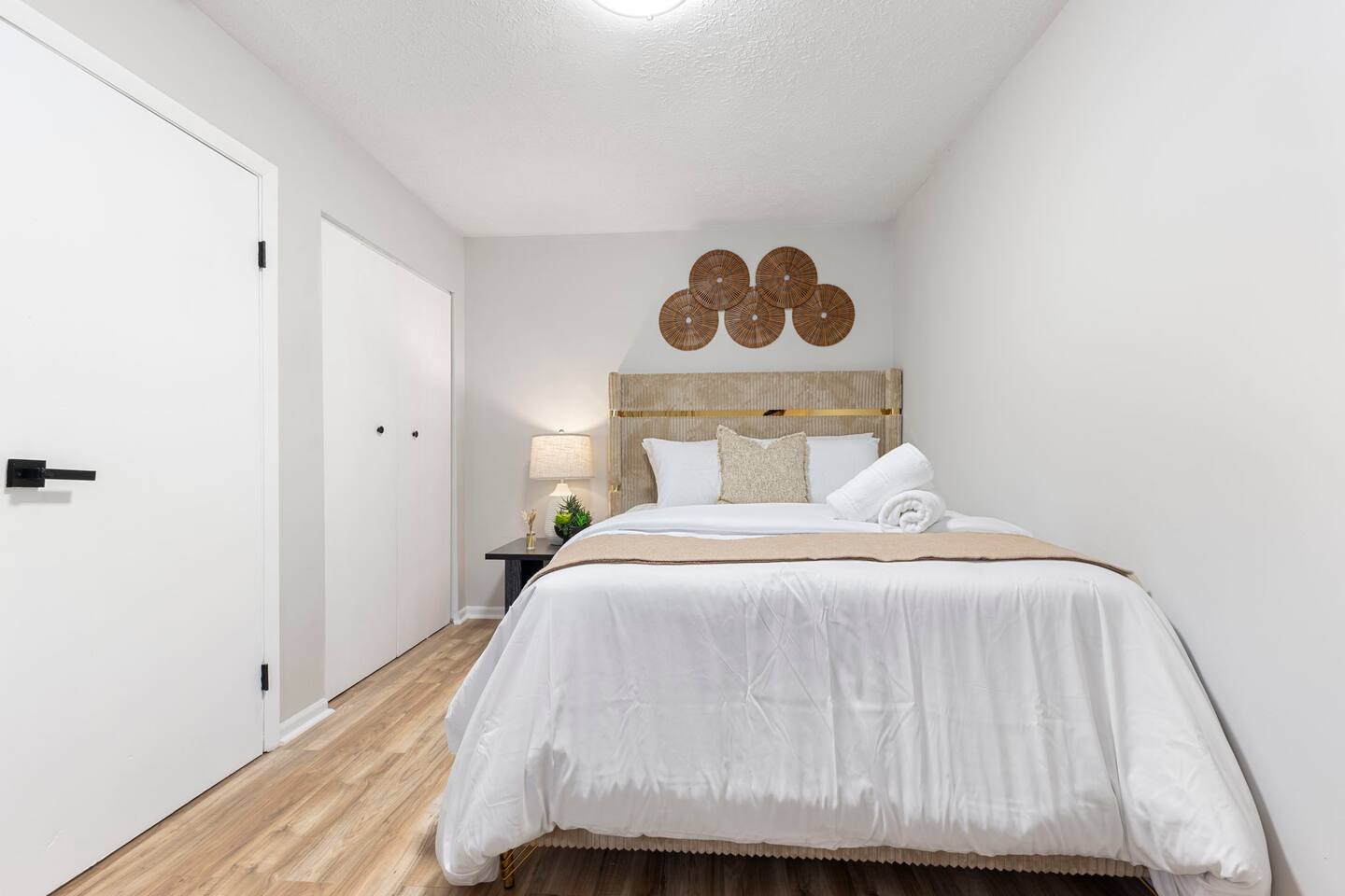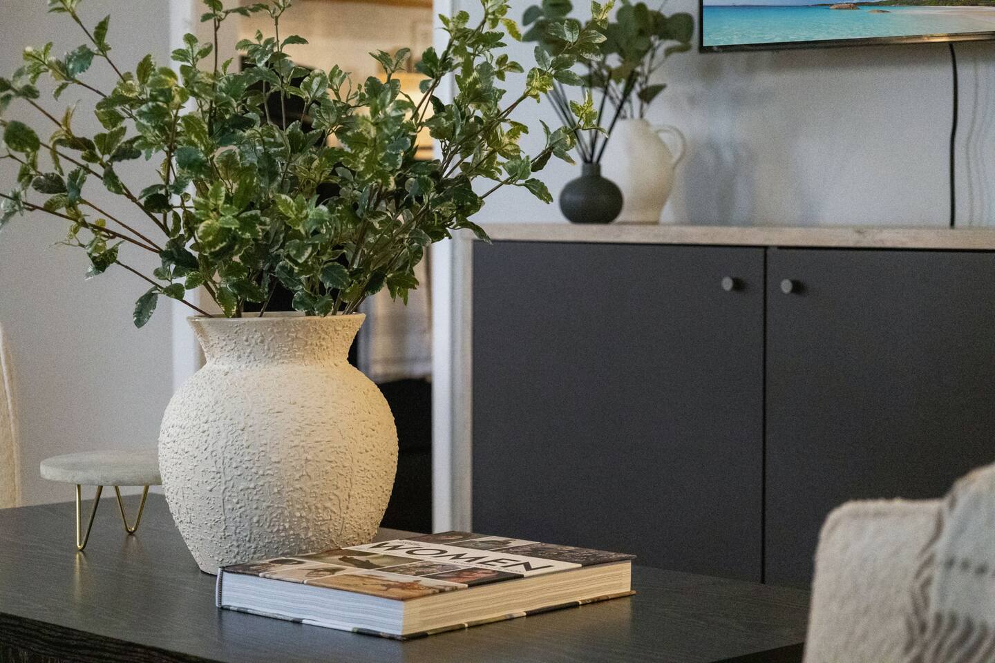 KEY FEATURES: ✔ 3 bedrooms with a King bed in the master suite, two queen beds plus a queen sofa bed in the living room, 8 max guests ✔ 2 bathrooms ✔ High speed internet + dedicated office space ✔ Fully Equipped Kitchen ✔ Playpen and high chair for baby/small child ✔ Washer + Dryer ✔ 65" Smart TV ✔ Family games BEDROOMS The master bedroom features a comfortable king-sized bed with plush pillows and a cozy duvet blanket. Two stylish armchairs with a matching throw blanket provide additional seating. A sleek coffee table sits between the chairs, perfect for enjoying a cup of coffee or a good book. Two other bedrooms have queen sized beds. All bedrooms are bathed in natural light from the large windows, which are adorned with flowing curtains. The neutral color palette and minimalist decor create an inviting atmosphere. Overall, this space is perfect for relaxation and rejuvenation. **Additional features** * A flat-screen Smart TV with Roku mounted on the wall (master bedroom only) * Ample closet space BATHROOMS Unwind and recharge in our clean and updated bathroom. The sleek design and soft lighting create a calm surrounding and the large mirror is perfect for getting ready. After a long day of exploring the city, soak in the bathtub and let the stress melt away. We provide complimentary Eco Botanics White Tea and Honey body wash, shampoo, and conditioner, all of which are gluten-free, paraben-free, and cruelty-free. A hair dryer, hair straightener, and makeup towels are provided for your convenience. OFFICE SPACE Need a quiet space to get work done during your stay? Escape and stay productive in our dedicated home office. The built-in bookshelves offer ample storage for your belongings, and the comfortable chair and desk provide a comfortable workspace. With **high-speed internet** throughout the house, you can easily connect to virtual meetings, send emails, and browse the web. Whether you're a digital nomad, a traveling professional, or simply working from home, our office space has you covered. KITCHEN + DINING Roll up your sleeves, unleash your inner chef and get cooking! We've stocked the kitchen with all the essential utensils, cooking pots, and small appliances you'll need to serve a family dinner. Whether you're a seasoned cook or a budding home chef, you'll love spending time in this space. You'll find essential appliances such as a microwave oven, toaster, rice cooker, blender, kettle, and a coffee maker with complimentary coffee, creamer, sugar, and tea. Kid-friendly, shatter-proof plates, bowls, drinking cups, and utensils are also readily available. The dining table seats 6 comfortably and for families with little ones, a slim foldable high chair with five point safety belt is always available for use. LIVING ROOM Come home to our cozy living room, sink into the plush couch, grab a blanket, and unwind with your favorite show on the smart TV. The room has plenty of natural light from the large windows, creating a bright and airy atmosphere. We've also included a selection of family board games to keep you entertained on rainy days or cozy evenings in. And when extra sleeping space is needed, the queen sofa bed provides a comfortable option for additional guests.