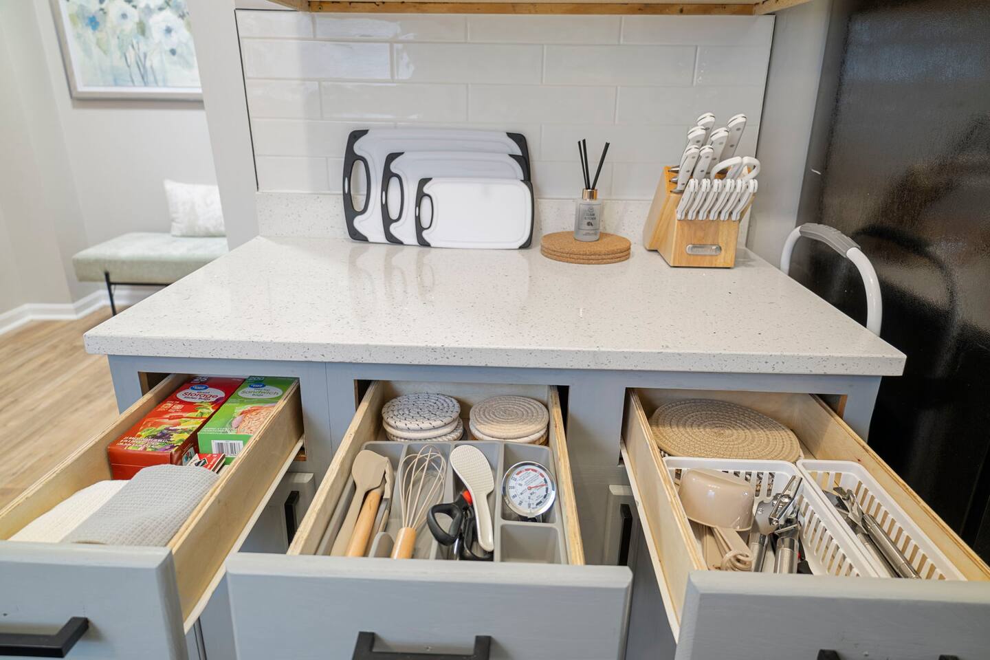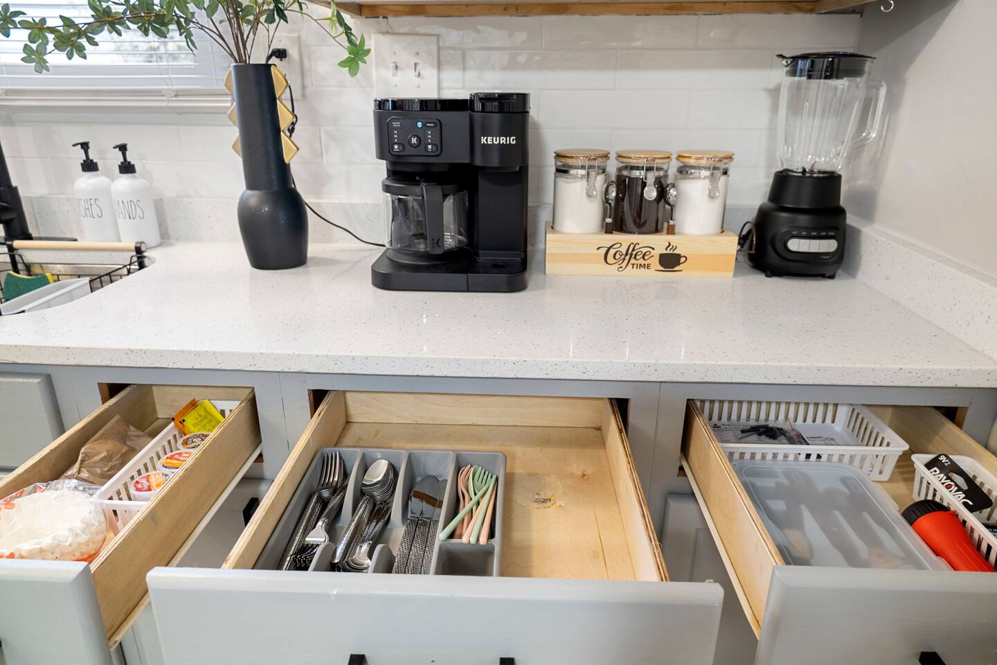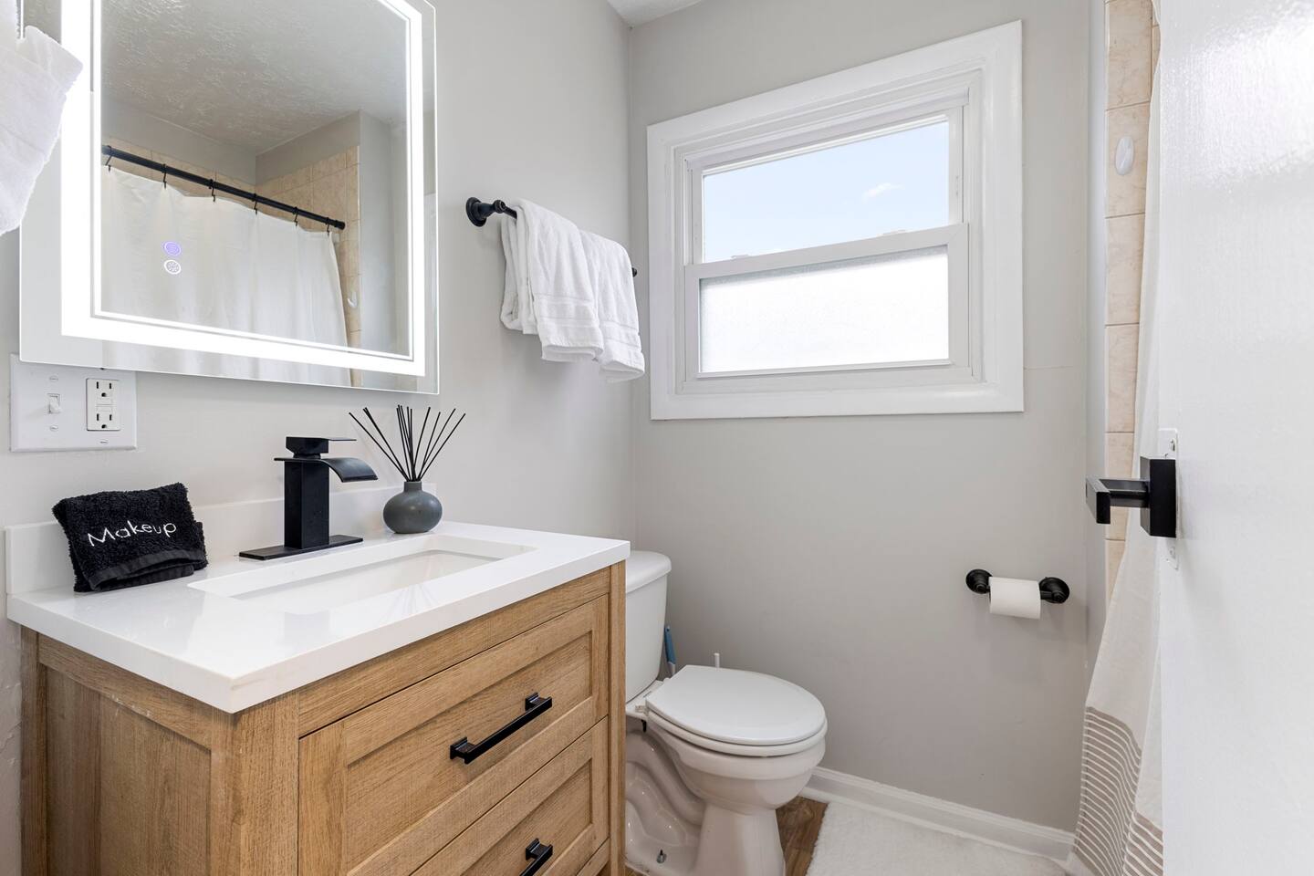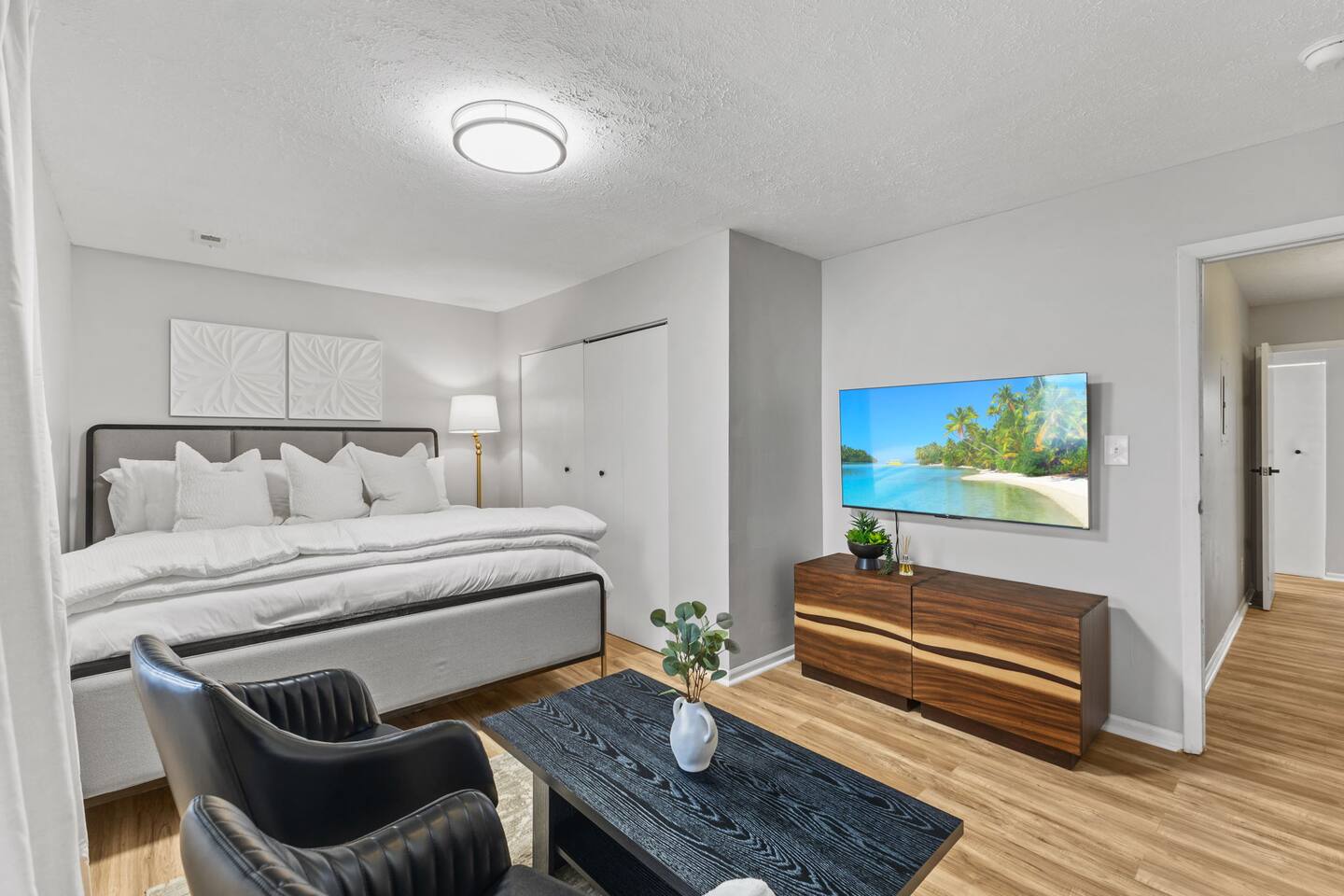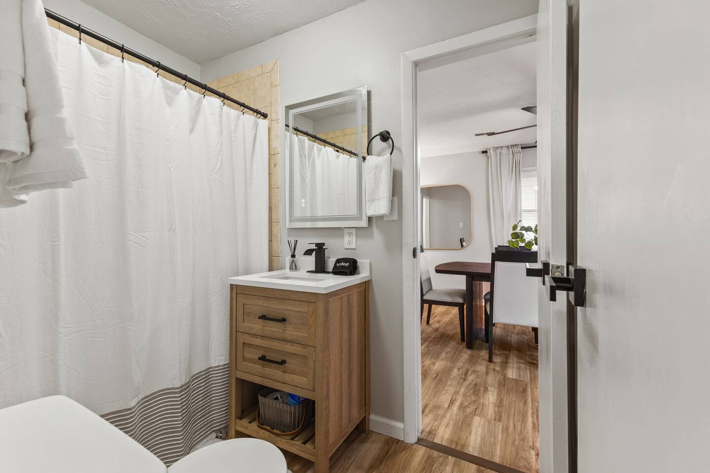 KEY FEATURES: ✔ 3 bedrooms with a King bed in the master suite, two queen beds plus a queen sofa bed in the living room, 8 max guests ✔ 2 bathrooms ✔ High speed internet + dedicated office space ✔ Fully Equipped Kitchen ✔ Playpen and high chair for baby/small child ✔ Washer + Dryer ✔ 65" Smart TV ✔ Family games BEDROOMS The master bedroom features a comfortable king-sized bed with plush pillows and a cozy duvet blanket. Two stylish armchairs with a matching throw blanket provide additional seating. A sleek coffee table sits between the chairs, perfect for enjoying a cup of coffee or a good book. Two other bedrooms have queen sized beds. All bedrooms are bathed in natural light from the large windows, which are adorned with flowing curtains. The neutral color palette and minimalist decor create an inviting atmosphere. Overall, this space is perfect for relaxation and rejuvenation. **Additional features** * A flat-screen Smart TV with Roku mounted on the wall (master bedroom only) * Ample closet space BATHROOMS Unwind and recharge in our clean and updated bathroom. The sleek design and soft lighting create a calm surrounding and the large mirror is perfect for getting ready. After a long day of exploring the city, soak in the bathtub and let the stress melt away. We provide complimentary Eco Botanics White Tea and Honey body wash, shampoo, and conditioner, all of which are gluten-free, paraben-free, and cruelty-free. A hair dryer, hair straightener, and makeup towels are provided for your convenience. OFFICE SPACE Need a quiet space to get work done during your stay? Escape and stay productive in our dedicated home office. The built-in bookshelves offer ample storage for your belongings, and the comfortable chair and desk provide a comfortable workspace. With **high-speed internet** throughout the house, you can easily connect to virtual meetings, send emails, and browse the web. Whether you're a digital nomad, a traveling professional, or simply working from home, our office space has you covered. KITCHEN + DINING Roll up your sleeves, unleash your inner chef and get cooking! We've stocked the kitchen with all the essential utensils, cooking pots, and small appliances you'll need to serve a family dinner. Whether you're a seasoned cook or a budding home chef, you'll love spending time in this space. You'll find essential appliances such as a microwave oven, toaster, rice cooker, blender, kettle, and a coffee maker with complimentary coffee, creamer, sugar, and tea. Kid-friendly, shatter-proof plates, bowls, drinking cups, and utensils are also readily available. The dining table seats 6 comfortably and for families with little ones, a slim foldable high chair with five point safety belt is always available for use. LIVING ROOM Come home to our cozy living room, sink into the plush couch, grab a blanket, and unwind with your favorite show on the smart TV. The room has plenty of natural light from the large windows, creating a bright and airy atmosphere. We've also included a selection of family board games to keep you entertained on rainy days or cozy evenings in. And when extra sleeping space is needed, the queen sofa bed provides a comfortable option for additional guests.
